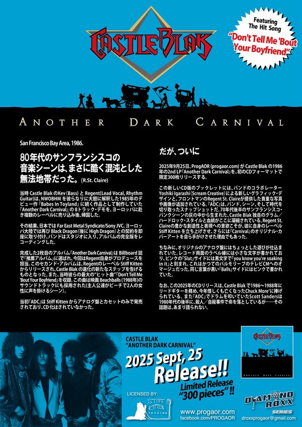 80年代のUS西海岸ベイエリア・グラム/ハードの重要バンド、カリフォルニア/サンフランシスコの80's Glam Metalの重要バンド、CASTLE BLAK!カセットのみだった1992年作の3rd 『No Bed of Roses』の奇跡のCD化の余韻が覚めない間に、遂に1986年作の2ndアルバムが残存していたアナログテープからのリマスターでオフィシャル初CD化!!昨年のSWEET PAINのオフィシャル初CD化に続いての2025年の一大事です!VAINよりも先にサンフランシスコから頭角を現したバンドで、HIT PARADER誌が選ぶ期待のバンドを集めた1985年のコンピレーションにもTEEZEやANTIXと共に収録されていた要注目のバンドでしたし、とにかくFEMSからリリースされた国内盤LPの中でLONDONの『Non-Stop Rock』と並ぶ二大巨頭の最重要アルバムとなるはずだった一枚であり、TORMEの『Back To Babylon』も加えてFEMS表彰台の1位〜3位を占める一枚であり、WRATHCHILD 『復讐のキッズ』 やCANDY 『ウィークエンドでファン・ファン』と同格に語られてもよいはずだった歴史的な一枚であるミッシング・アイテムです!!お馴染みのKISSのカヴァー「Do You Love Me」やGRAND FUNKで知られる「Some Kind Of Wonderful」を含み、グラム・ロックやKISS等からの影響をシンプルでキャッチーに鳴らす80's Glam/Sleazy Rock 'N Rollの元祖の一枚です!Youtubeにも全曲は挙げられておらず、サブスクにもたぶん入っていない(私Nはやってないので知りません・・)ので、必ずこのCDで入手しておかないといけないのですが、なんせ限定300枚のみですので世界で選ばれし一人になるべく80's Glam Metal&Glam/Sleazyジャンキーの方々はお手元に!