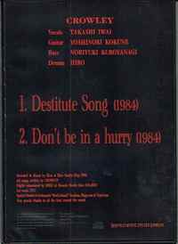 1984年にリリースされた『From Electric Lady land ’84』(TILT,LUSHEL,CROWLEY,LEMURIAによるELLのオムニバス)に収録されていた2曲の別ミックス/ラフミックス・ヴァージョンを収録した2曲入りCD!当時からの熱心なCROWLEYファンも驚愕の初蔵出しヴァージョンによる音源!DVD型トールケース仕様、プレスCD。 『84年にリリースされた「From Electric Lady land ’84」に収録されていた2曲、「Destitute Song」と「Don’t be in a hurry」の別ミックス、つまりラフミックスヴァージョンを収録した2曲入りCDです。オムニバスLP盤に収録されていたヴァージョンとは明らかに音やバランスが違い更にデジタルマスタリングをしてあるので聴こごたえ十分な作品です!』(オフィシャル・ストア商品紹介より)DME-014 1. Destitute Song (1984) 2. Don't be in a hurry (1984) TAKASHI IWAI (Vo.) YOSHINORI KOKUNE (G.) NORIYUKI KUROYANAGI (B.) HIRO (Ds.)
